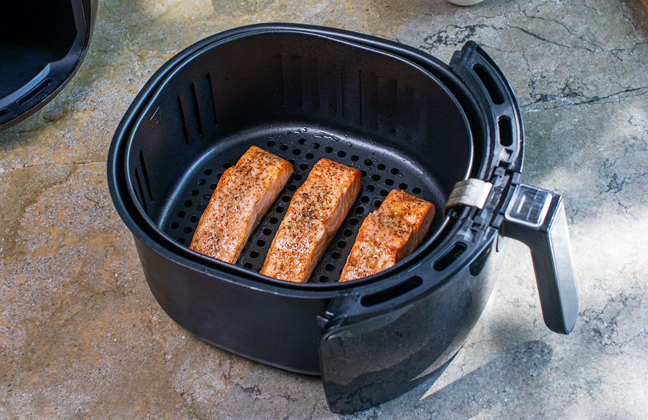 Air frying salmon is easy, quick and gives you a great result. Pat the salmon dry to help it crisp, then sprinkle with salt and pepper. Air fry salmon at 200°C for 6 to 7 minutes. Thinner tail-end pieces will cook more quickly than thicker, center-cut pieces. Serve it with your favourite sides and you got a tasty salmon meal. Why not try this recipe?