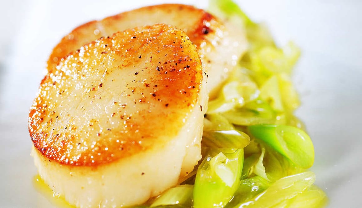 Add scallops on the pan and fry on medium heat for approx. 30 seconds on each side. Place on a plate.