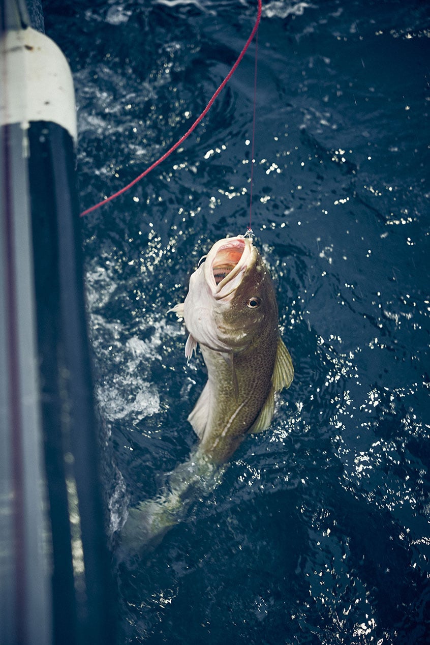 Seconds later, the first hooks are drawn carefully out of the ocean. Lauritzen stands by the railing, constantly monitoring the fish lines, guiding the catch gently onto the awaiting tanks as it's pulled out of the ice-cold water. First some haddock, then some large cusk, and finally, bright arctic cod emerge from the sea, one after the other.
