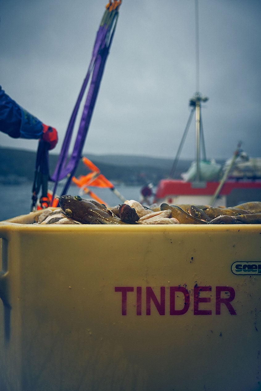 With all lines hauled in, Tinder sets its course towards the local fish processing plant in Kjøllefjord, opposite the harbour. Cruising in, Lauritzen picks up his phone and calls the plant, letting them know that Tinder will soon be dropping off today's catch. They know him well. After all, this is the only place he has ever delivered fish. Ever since Lauritzen started in 2005, his trips have always ended here. He contentedly lists the breadth of today's catch—cod, haddock, cusk and Atlantic halibut. As Tinder steadily approaches the plant, the team stands ready to lift the catch out of Tinder to expertly process and send it off to European markets as quickly as possible. Lauritzen goes and gets his helmet from behind a hanger as the boat nears the quay. He stops for a second and looks at the three-person team waiting for him, ready to handle containers of fish no more than an hour out of the water. “This is what I always say: We would never deliver anything that we wouldn't happily eat ourselves,” Lauritzen says against the radio's static as he steps out onto the deck.